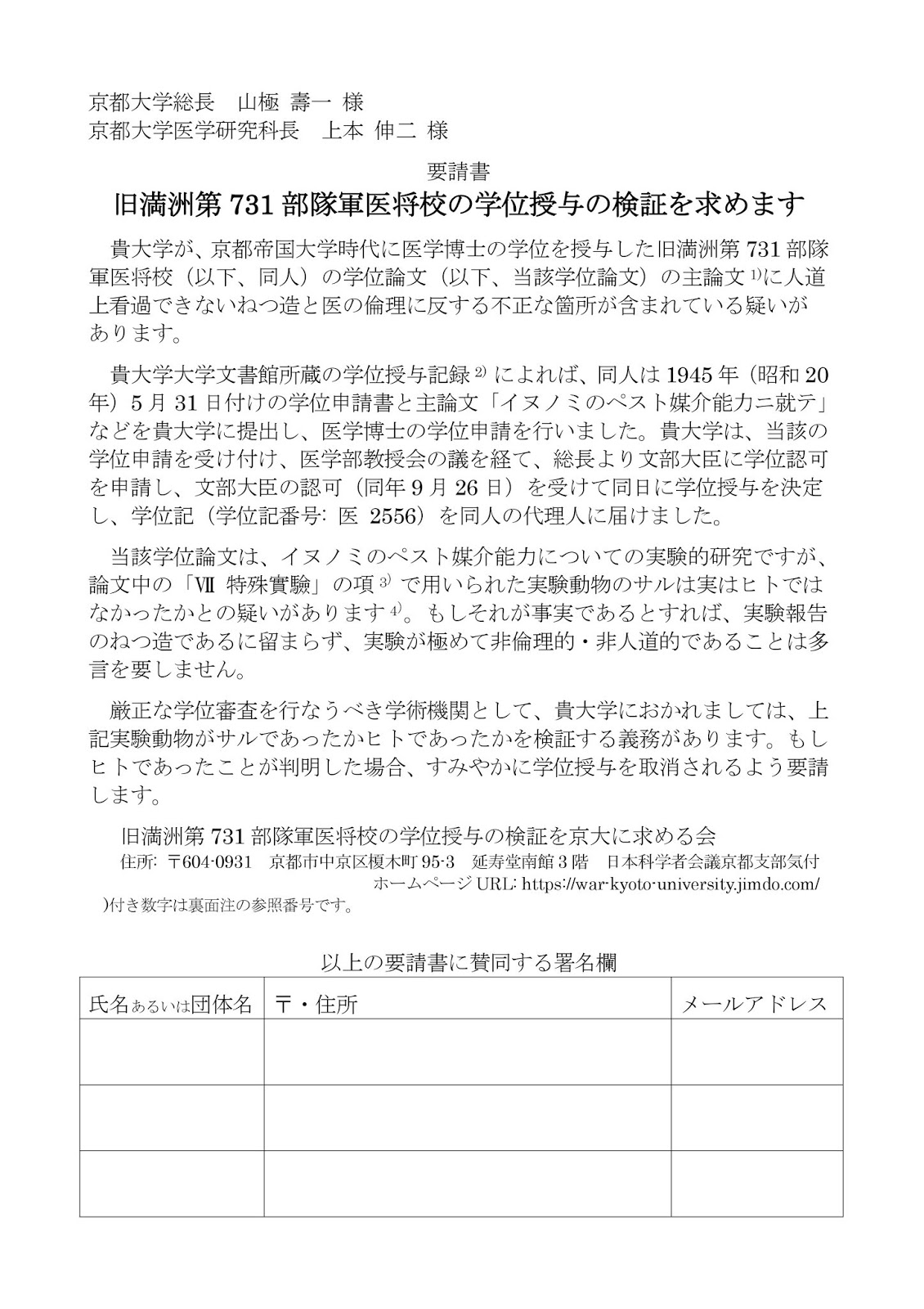 満洲第731部隊軍医将校の学位授与の検証を京大に求める会